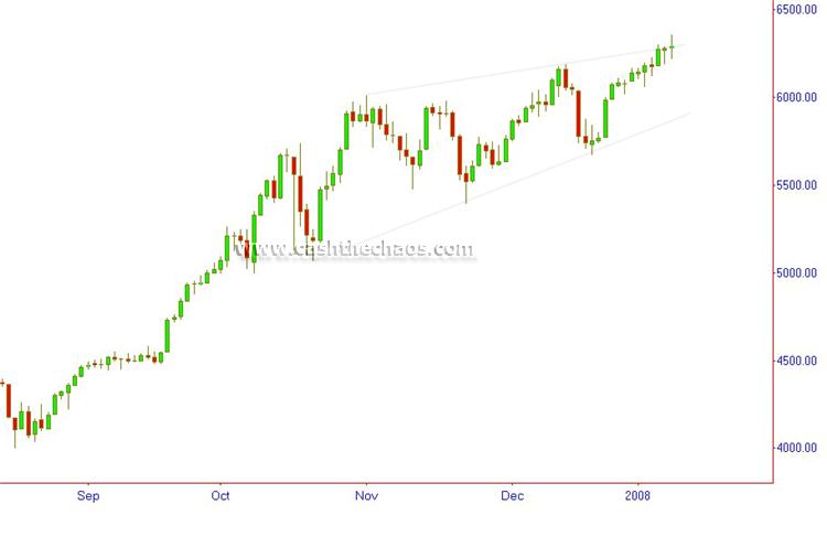 On a separate note, regular readers would know that we had pointed to the possible end of the bull market in the US on Nov 22nd 2007, when the Dow Jones went below its primary support. Yesterday's weak close in US markets has taken the broader S&P500 and small cap Russell 2000 below their primary support of 1400 and 725 respectively. Hence, in all probability the top in the US markets are in place. A fed rate cut of 50bps later this month at best may bring in a bear rally for the US markets.